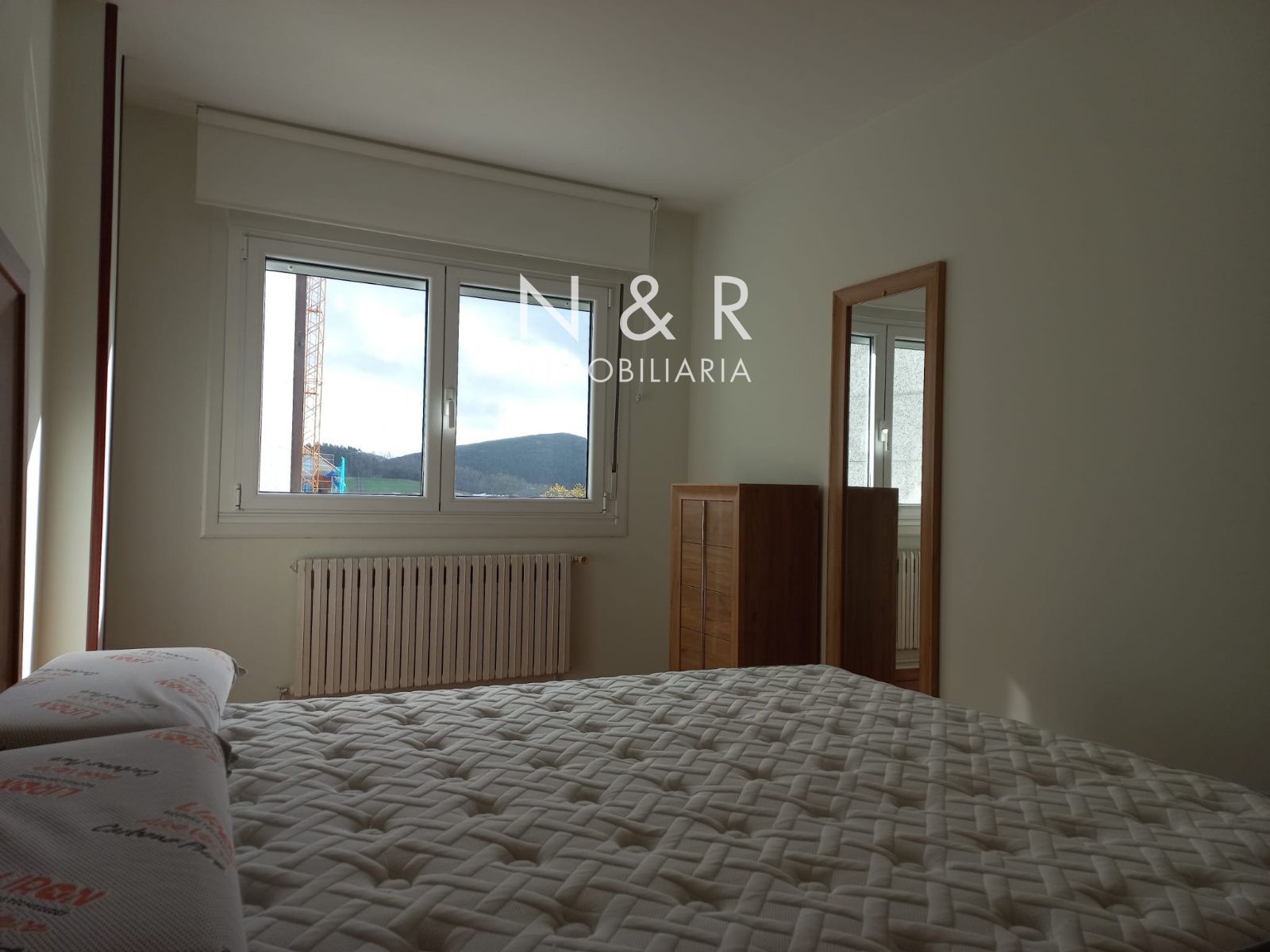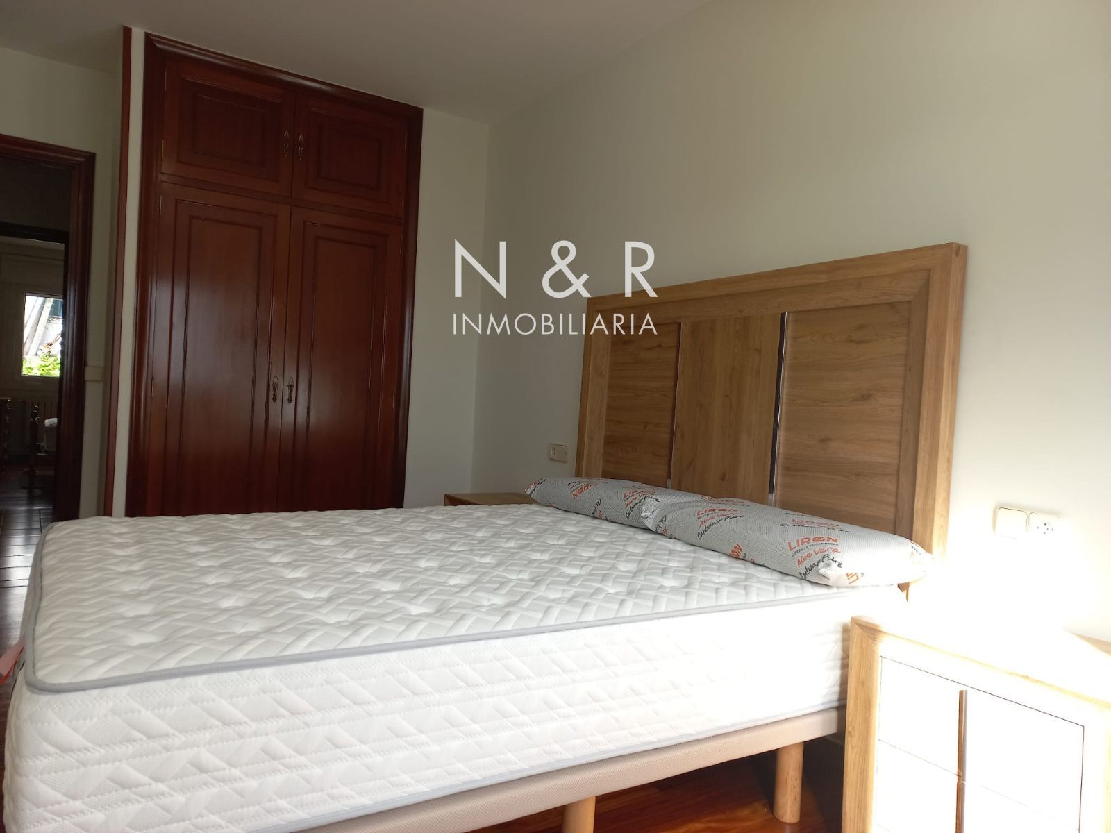 Cama de matrimonio, armario amplio, silla y decoración sencilla.