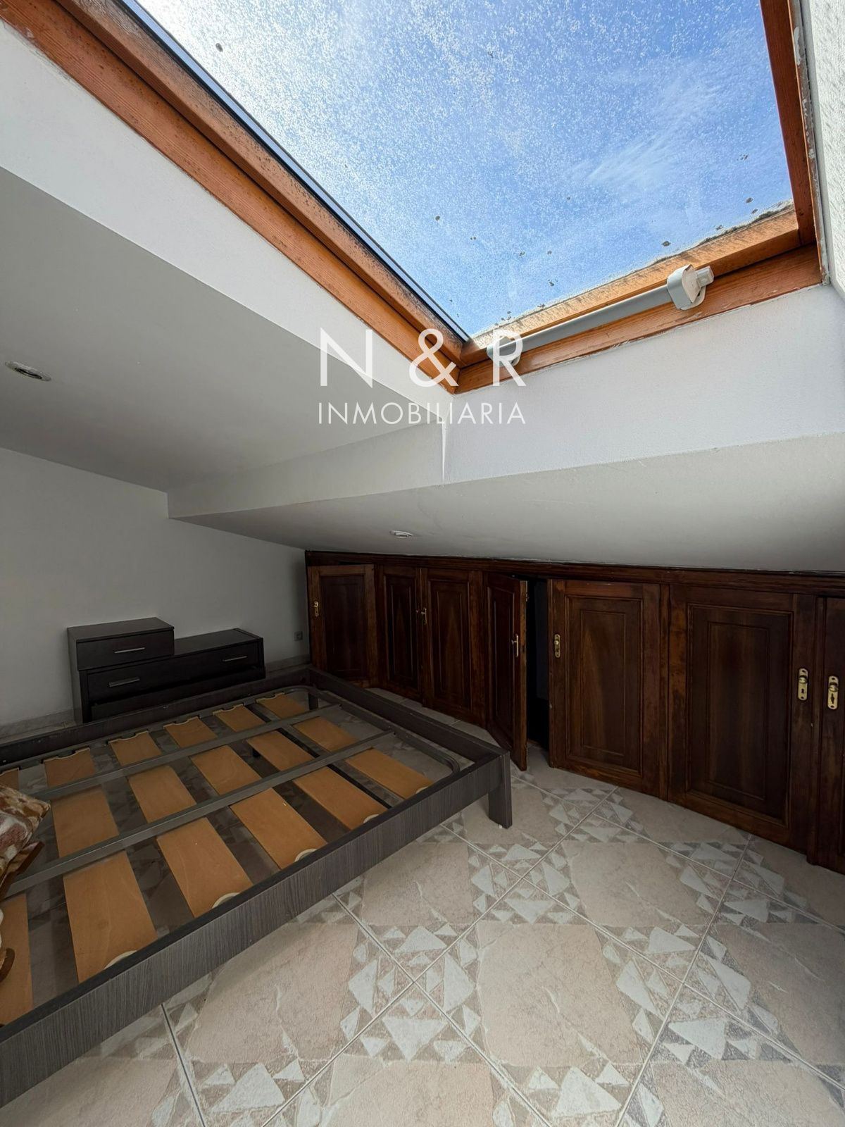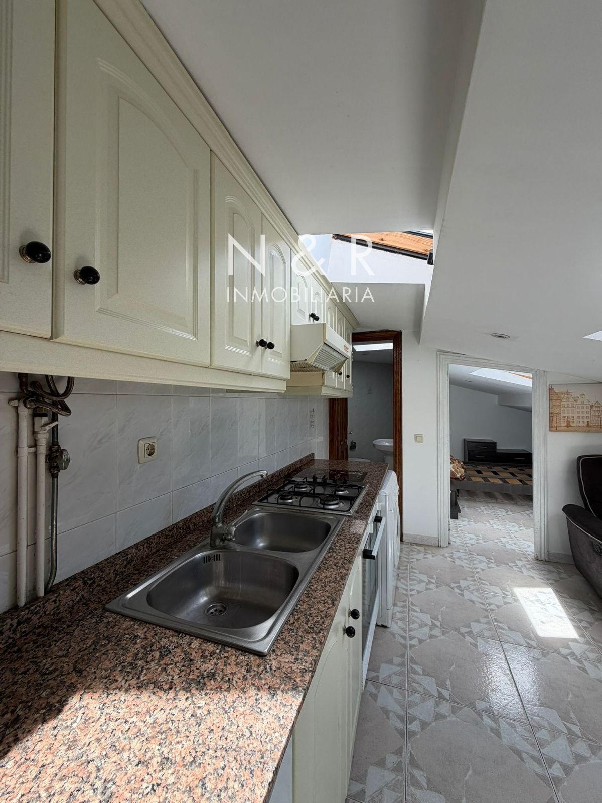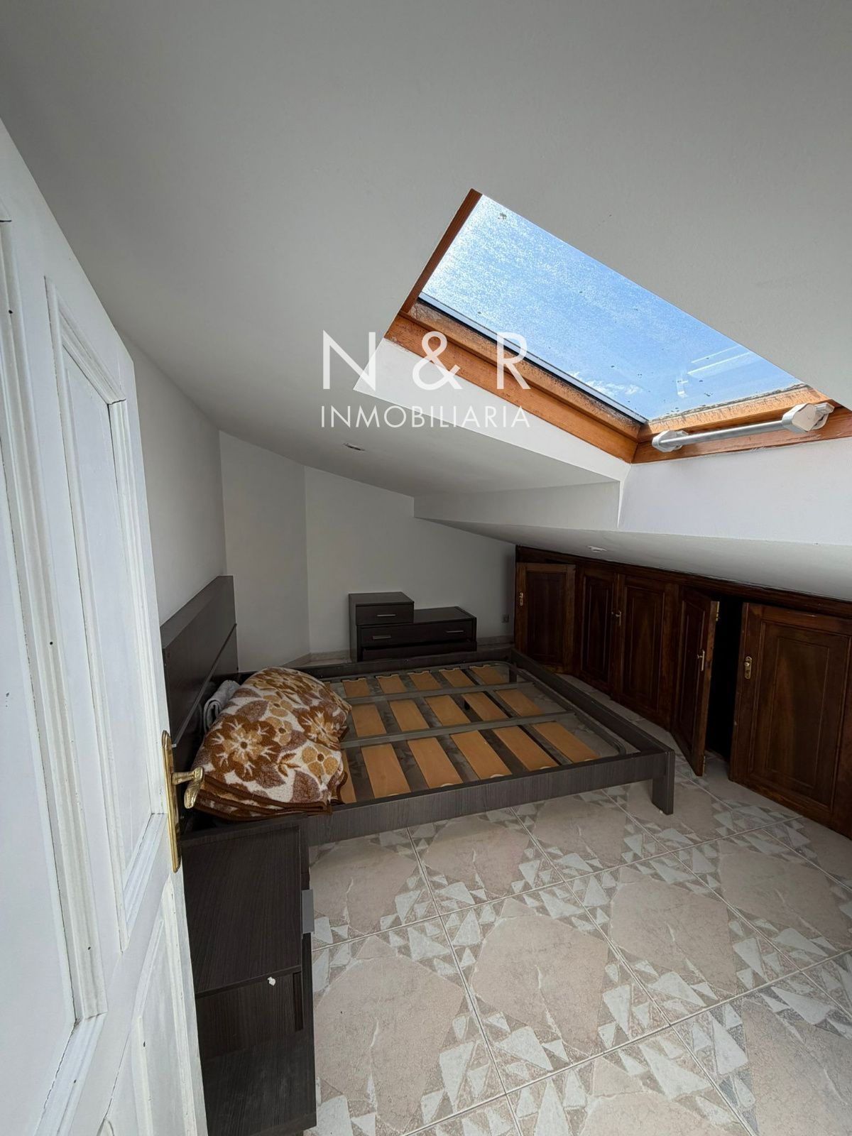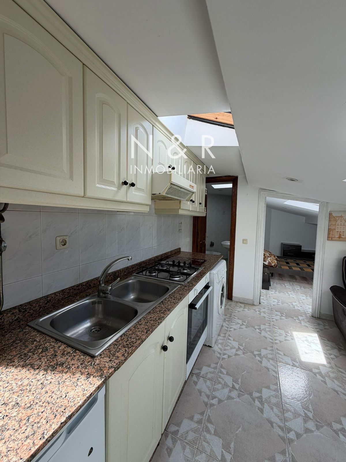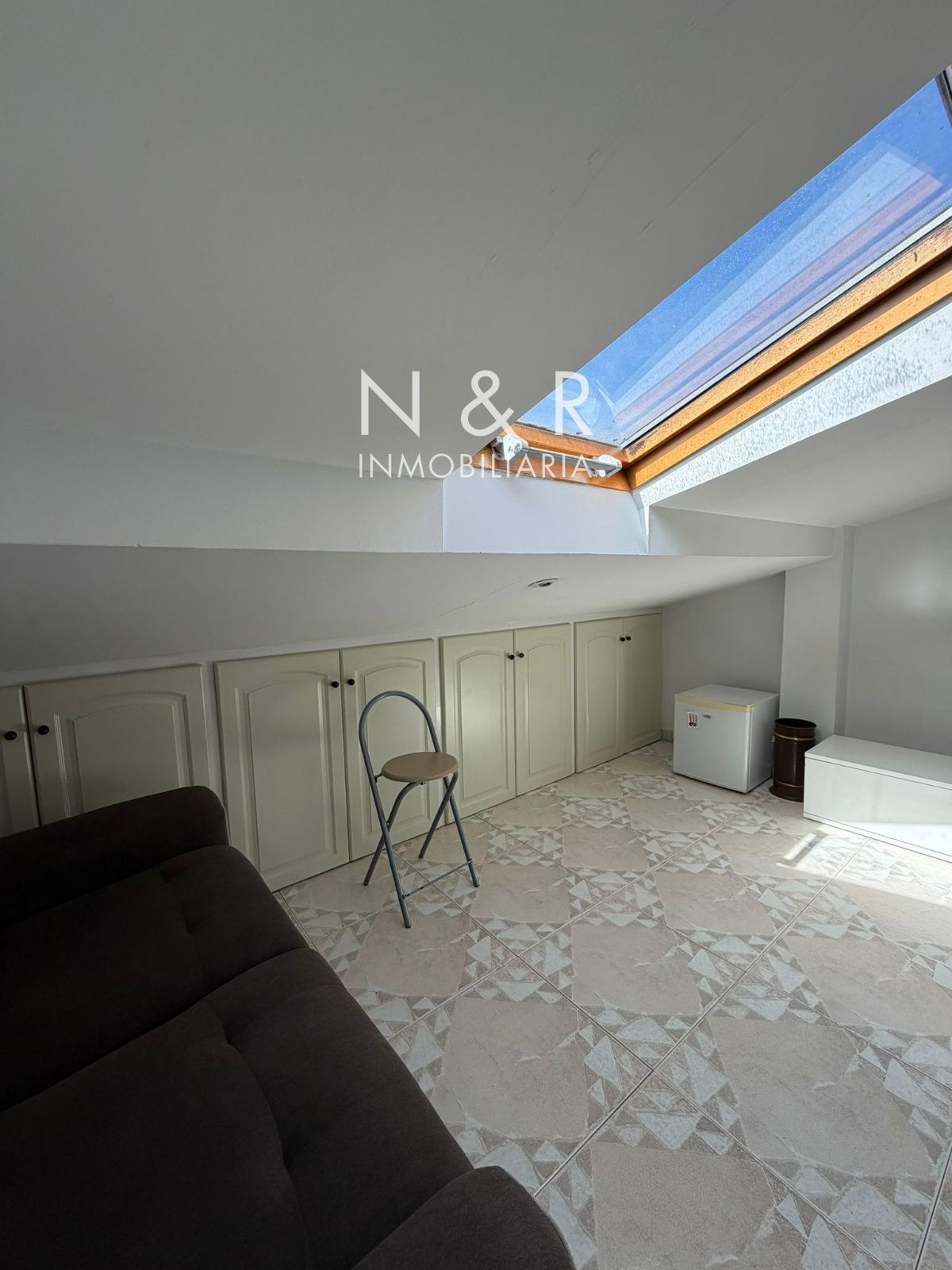 Ático luminoso en alquiler con salón y cocina integrados, una habitación con prácticos armarios empotrados y un baño completo.